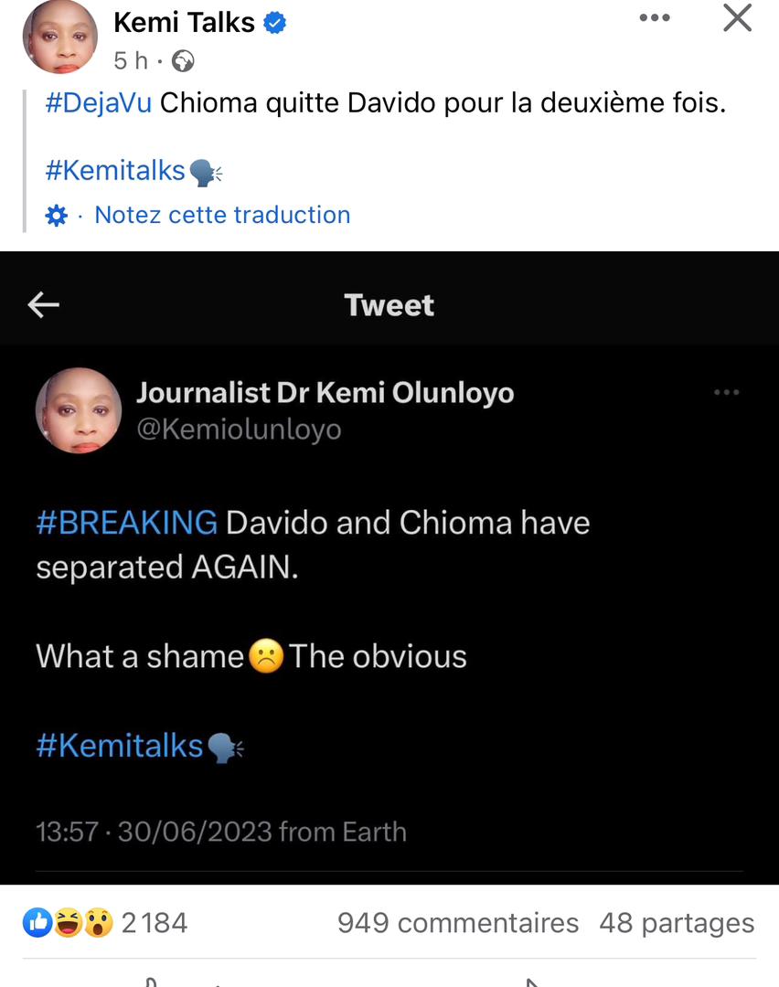 L’information reste encore à confirmer, mais, selon la journaliste d’investigation, Dr Kemi Olunloyo, Chioma aurait quitté Davido pour la deuxième fois.